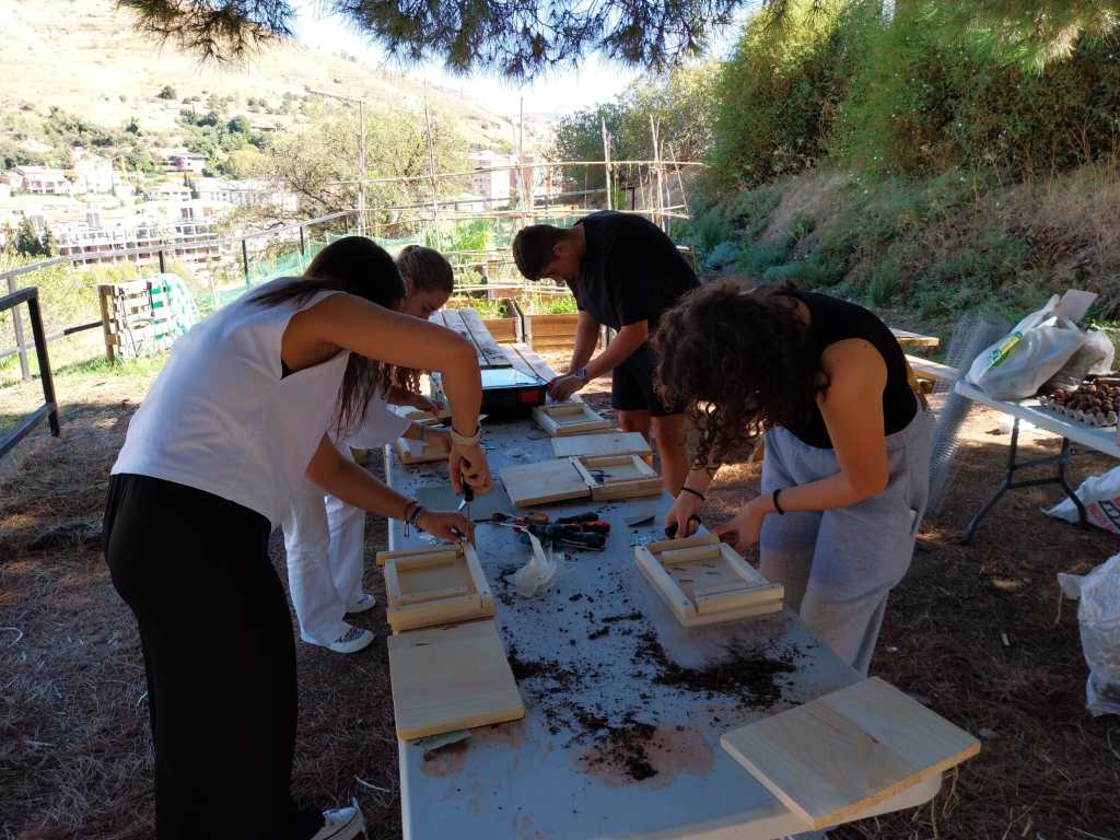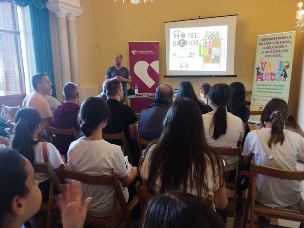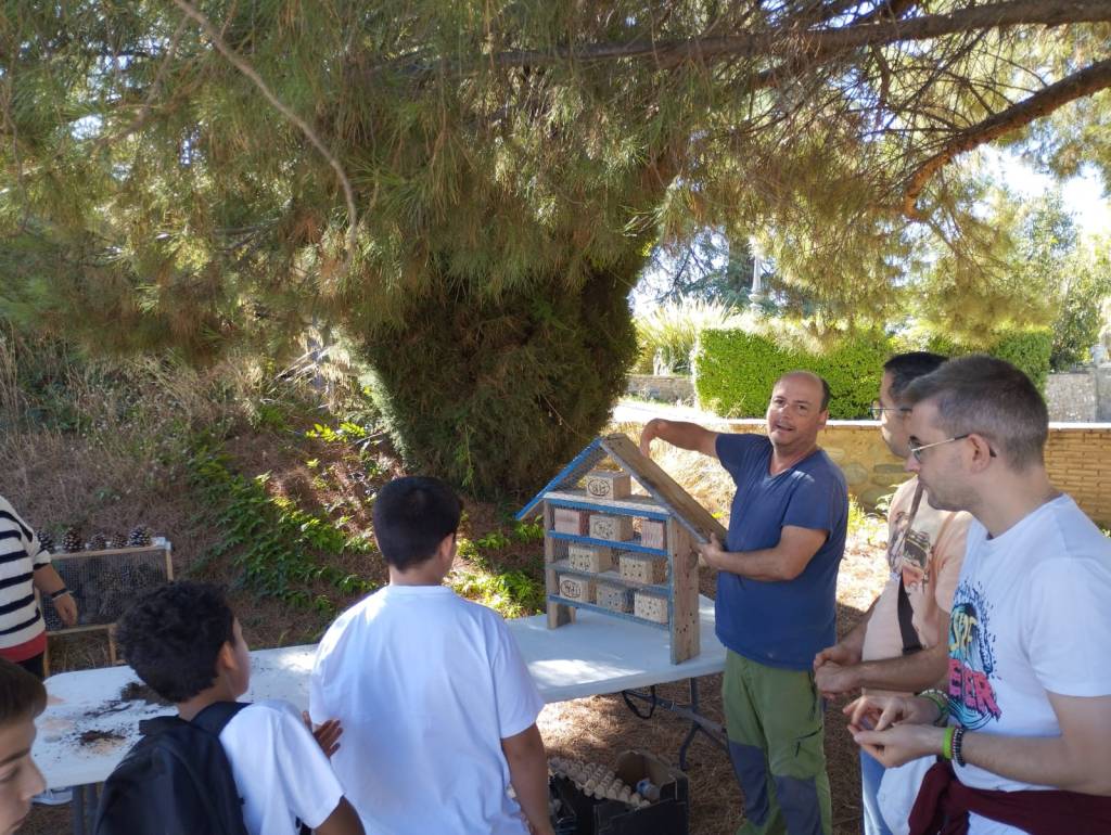 En la primera, un taller sobre Hoteles de Bichos, con un público constituido por alumnos de CES Santiago Ramón y Cajal y algunos inscritos individuales, a los que, tras una presentación de qué es eso de los hoteles de bichos, nuestros amigos de la Boronda enseñaron a crear sus bombas para polinizadores. Una propuesta complementaria a estos hoteles de bichos y que potencia su uso, al proveer a los mismos de un entorno natural más diverso en el que aparecen nuevas plantas atractivas para los polinizadores, que a su vez, pueden ser inquilinos de esos hoteles. Después, montamos uno de los hoteles creados por los amigos Vario Pinto del centro de Jabalcón, y pasamos de la teoría de la primera parte del taller a la práctica del montaje de una instalación tan singular.