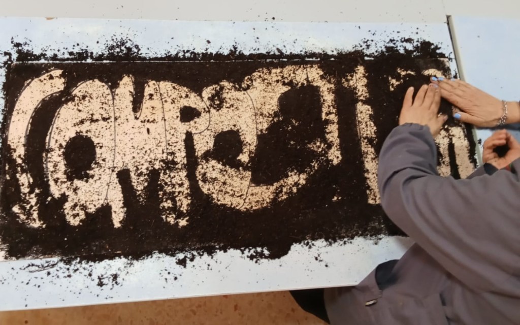 Para terminar, quisimos hacer una intervención artística con la temática de la formación, en un tablón escribimos “COMPOSTERA”, pintamos con cola blanca fuera de esas letras y añadimos compost, luego pegamos residuos orgánicos dentro de las letras. Resultado, un cartel que podremos poner junto a la futura compostera que recuerda que se puede depositar en la compostera y que resultado final esperamos. Y además una pequeña obra de arte.